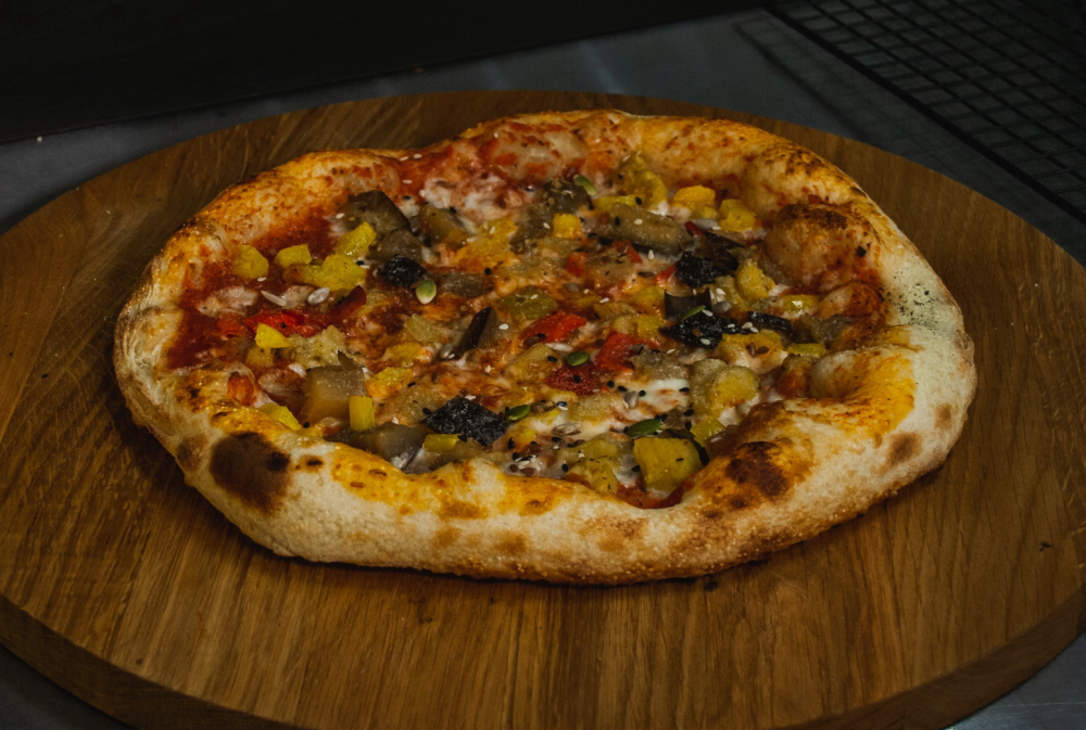 Соус томатный, сыр моцарелла, запеченые баклажаны, кабачки, красный и желтый сладкий болгарский перец, грибы, вяленые томаты, сыр Пармезан