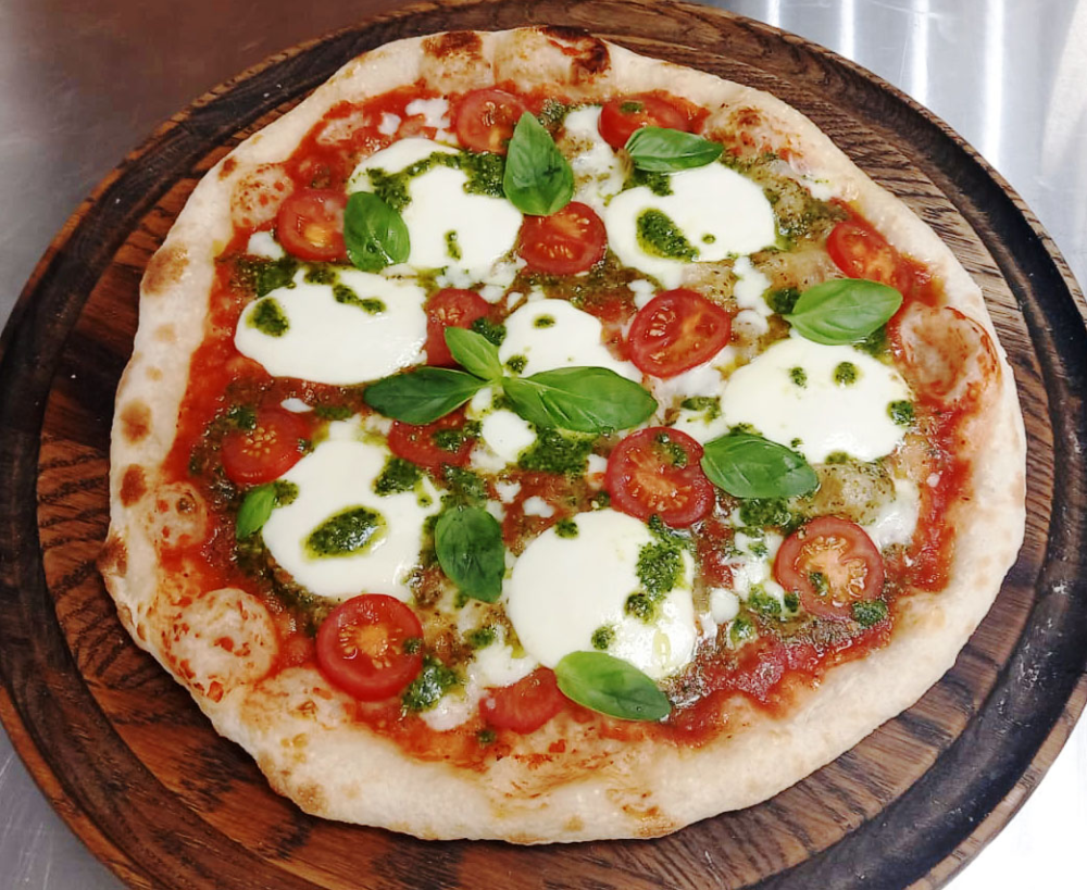 Соус томатный, соус Песто, сыр Моцарелла ассорти, помидоры Черри, сыр Пармезан