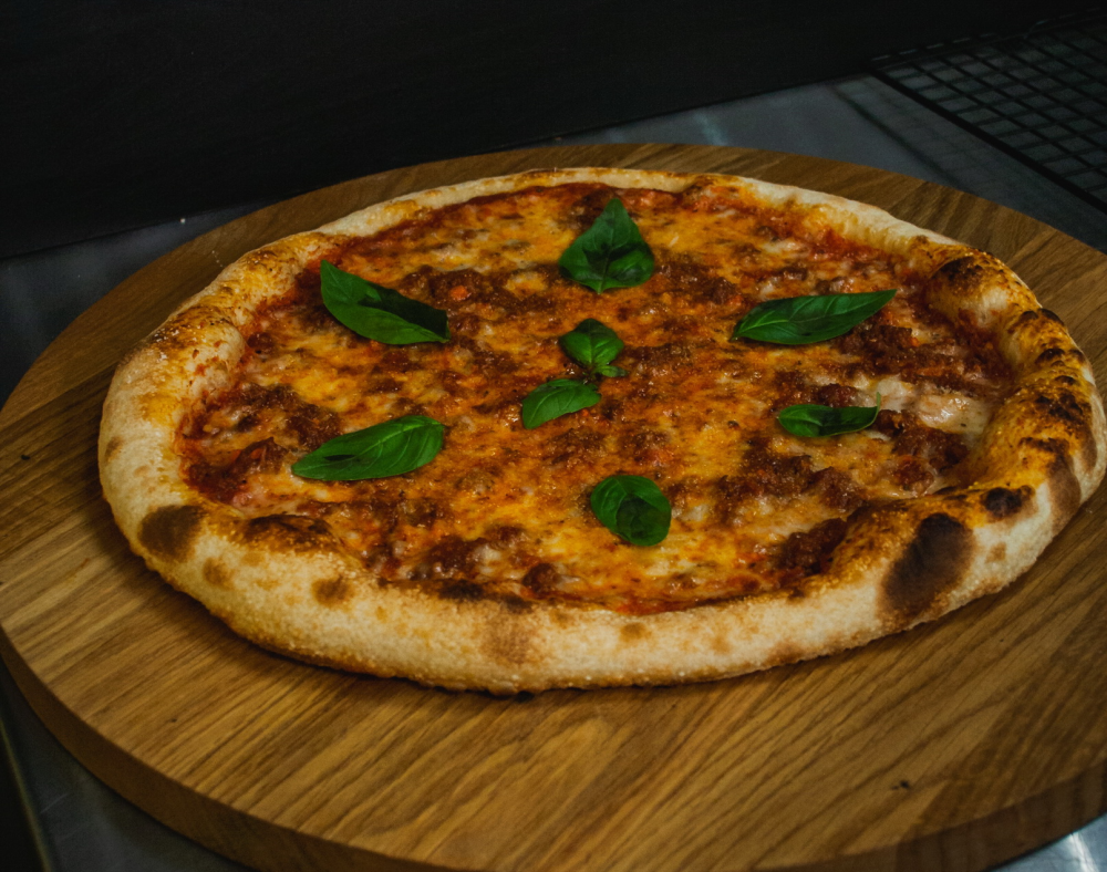 Соус томатный, сыр моцарелла, фарш говяжий в соусе Болоньез, помидоры Черри, сыр Пармезан